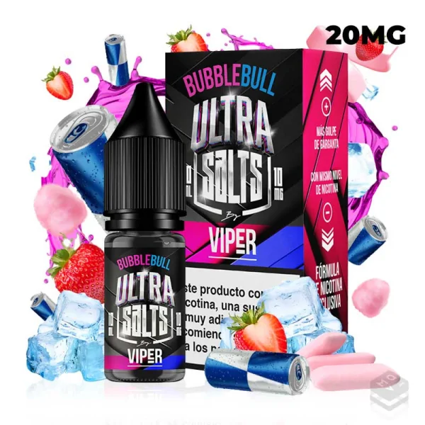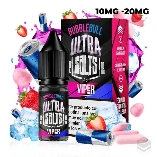 Buy Bubblebull Ice vape liquid from Ultra Salts by Viper is an excellent unique combination of flavours that includes energy drink, strawberry bubble gum and a touch of ice, ideal for revitalising your senses. You can buy it in Masquevapor's online shop or in one of their physical shops for only 4.90€. This price is very affordable for a high quality product that offers you an exotic and pleasurable vaping experience.