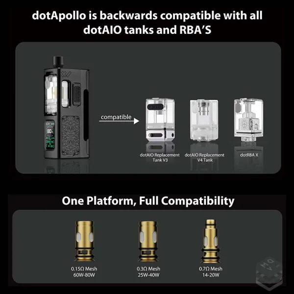 The DotApollo is an all-in-one (AIO) kit integrating both mod and tank into a single, compact unit. Key features include: