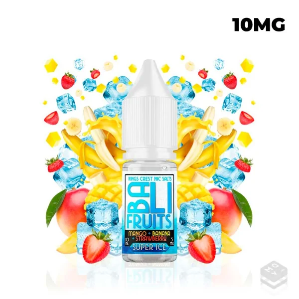Mango, Banana, Strawberry and Super Ice 10ml nicotine vape liquid from Bali Fruits Salts by Kings Crest offers a silky burst of mangoes, bananas and a selection of delicious strawberries, over an extra fresh background that will provide you with a refreshing and satisfying vape experience.