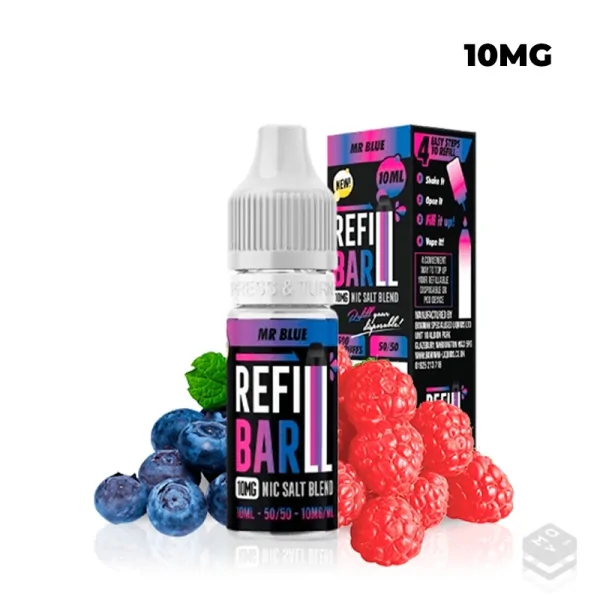 Refill Bar Salts Mr Blue nicotine salts are a vape liquid variant that uses nicotine salts instead of the nicotine-free form common in traditional liquids. This format offers a smoother and faster nicotine delivery, providing a satisfying vape experience.