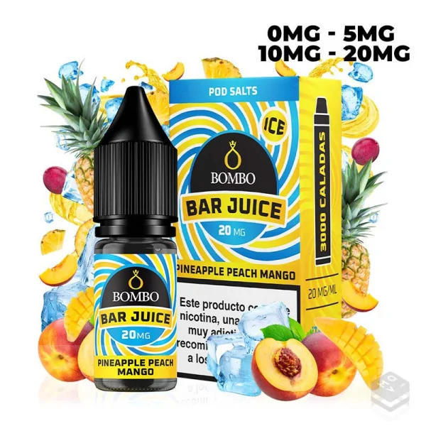 Pineapple Peach Mango Ice liquid from Bar Juice Nic Salts by Bombo offers an unparalleled tropical vape experience. This exquisite blend combines the sweetness of pineapple, the juiciness of peach and the intensity of mango, creating an exotic and refreshing taste that will delight your senses.