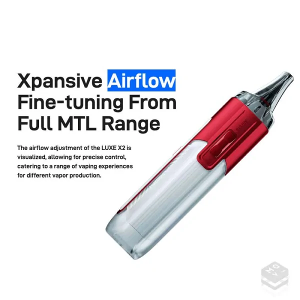El Luxe X2 presenta un sistema de flujo de aire visualizado que permite un ajuste preciso, satisfaciendo las necesidades de los usuarios que prefieren un vapeo MTL desde una producción moderada hasta una más densa. Los pods de 0.6 / 0.8Ω son compatibles con el dispositivo, permitiendo una personalización completa de la experiencia de vapeo. La batería de alta densidad, combinada con la avanzada tecnología de celdas, permite aumentar la capacidad de la batería sin sacrificar el diseño compacto del Luxe X original. Esto, junto con el flujo de aire ajustable, permite a los usuarios explorar una amplia gama de experiencias, desde bocanadas suaves hasta inhalaciones más intensas con mayor producción de vapor.